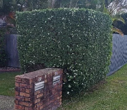 Moderate to fast growth rate. In Brisbane’s warm climate, Mrraya produces multiple strong flushes of growth from spring through early autumn. Peak season growth can require trimming every 4-6 weeks to maintain a sharp finish. Our annual hedge product package can extend these intervals to 6-8 weekly and results in a better looking hedge year round. Murraya are generally hardy and pest resistant when healthy and not stressed. Our once yearly slow release fertiliser application helps to boots plant health, minimise pest issues and look it’s best with consistent dark green foliage. Borers are one pest that can cause gradual damage to even the best kept Murraya hedge. We offer long term prevenative and curative treatments, and the benefit of our regularly scheduled visits are that we can keep a close eye on things and take action before large issues appear.
